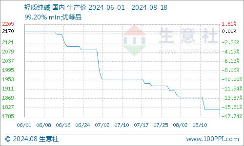 据生意社商品分析系统显示,本周纯碱价格持稳运行。截止8月19日纯碱市场均价在1820元/吨,与8月13日价格1820元/吨相比持平,环比下调5.99%。