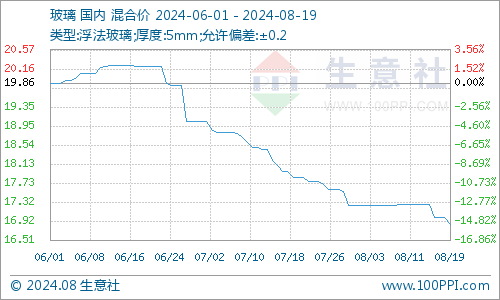 需求方面:据生意社商品分析系统显示,玻璃价格行情弱势下行,截止8月19日市场均价在16.85元/平方米,与8月13日市场均价17.27元/平方米相比,跌幅2.43%。玻璃市场开工高位,库存量充足,下游需求偏弱,市场看空笼罩,目前个别产线已放水冷修,后市玻璃价格跌幅或有放缓。