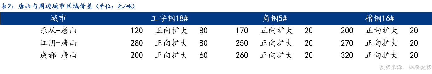 从区域价差来看,乐从,江阴,成都工字钢、角钢、槽钢与唐山价差正向扩大。
