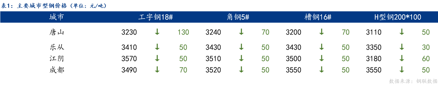 今日型钢主流价格宽幅趋弱调整,唐山工字钢、角钢、槽钢、H型钢价格较上一交易日下跌50-130元/吨;乐从工字钢、角钢、槽钢、H型钢价格较上一交易日下跌30-50元/吨;江阴工字钢、角钢、槽钢、H型钢价格较上一交易日下跌50-60元/吨;成都工字钢、角钢、槽钢、H型钢价格较上一交易日下跌50-70元/吨。