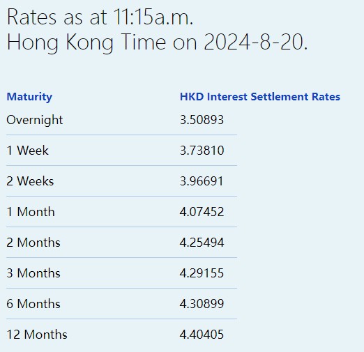 8月20日,港元拆息全线下跌,隔夜息再跌8基点至3.50893%,续创5月7日以来新低,与楼按相关的一个月拆息三连跌,报4.07452%,见一周新低。