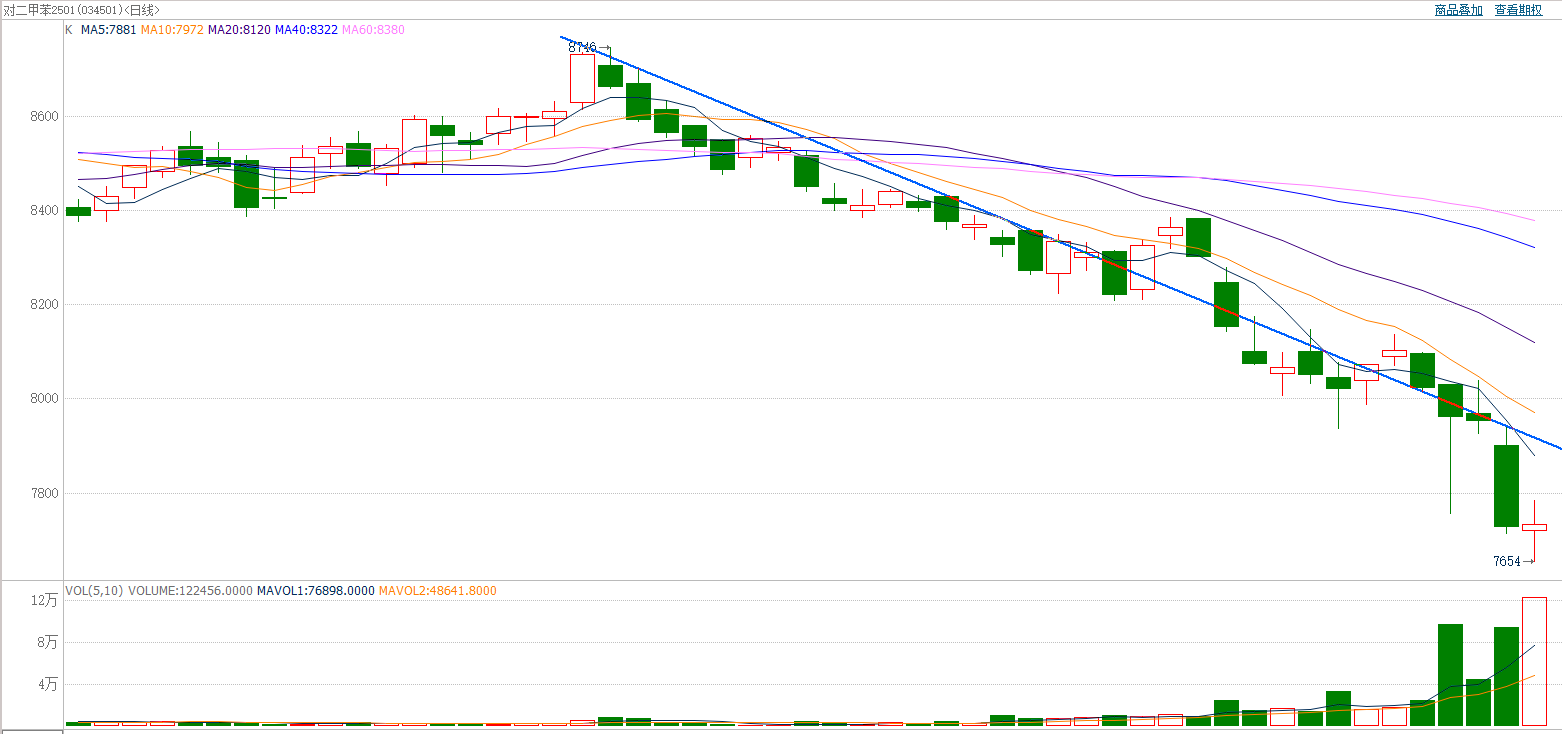 截至前一个交易日收盘,PX底部盘整,收小阳线。日k线近期破位下行,处于主跌浪。