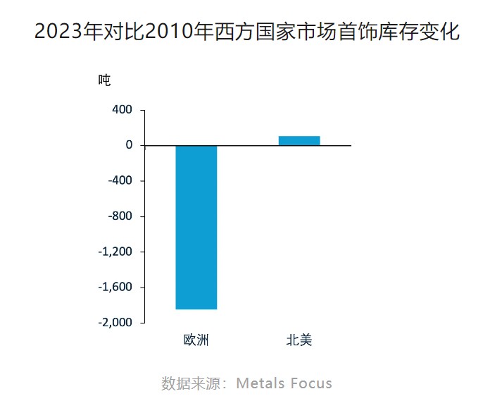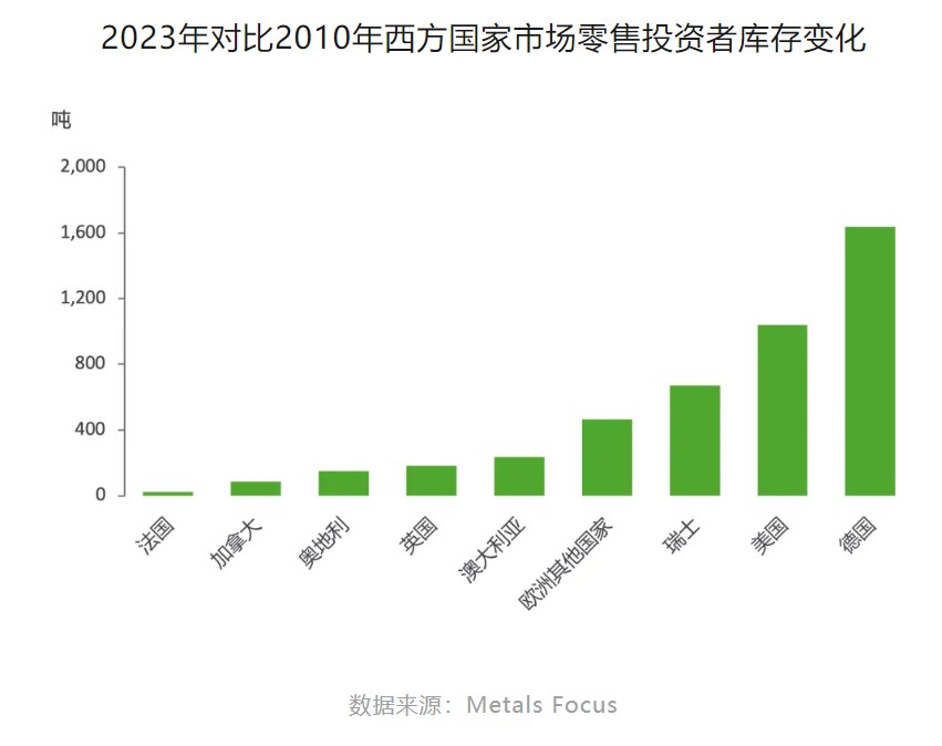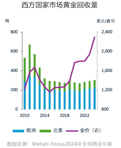 在现有首饰存量水平下,不管金价和经济增长如何,欧洲旧金饰回收供应量都很可能受限。不过也应看到,2010-2023期间欧洲消费者持有的金饰存量仅下降10%-15%左右。美国金饰回收供应量增长潜力可能更大,但有人认为美国存量仍低于欧洲。