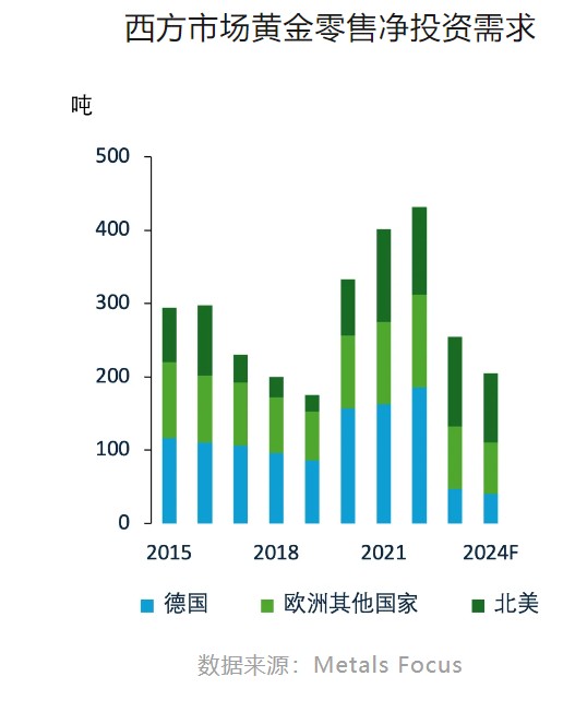 过去十八个月期间德国黄金零售投资需求量大幅下降,MetalsFocus认为存量水平应该是背后的一个重要因素。该国市场人士反馈的信息显示,消费者继承的黄金对存量水平的影响小,影响更大的因素是当前一代消费者中认为已买够“充足的”黄金的人数占比持续上升,获利了结仅加剧了净投资量的降幅。