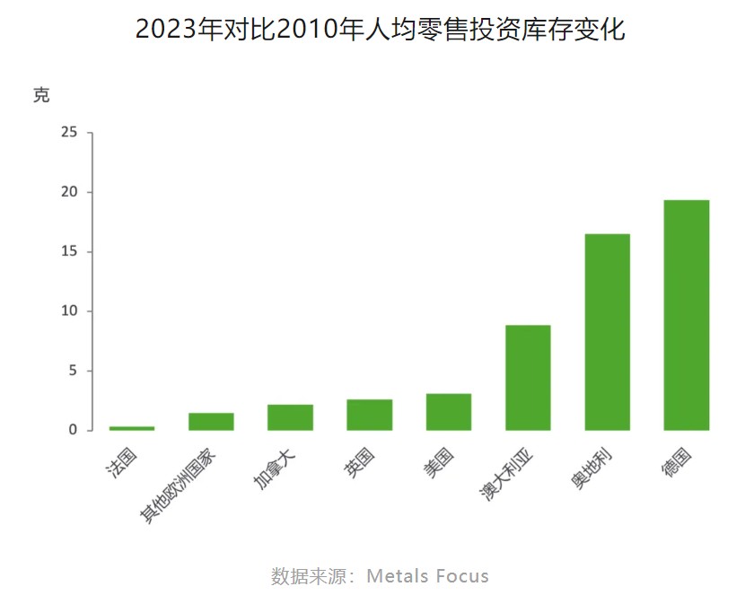 展望未来,由于存量高欧洲德语国家的黄金零售投资需求前景可能会令人失望,其他西方国家(法国除外)的市况则将好一些。从更宽广的视角看,同一期间印度和中国消费者的人均黄金净购买量分别约为2.1克和2.5克,显示一些西方国家消费者的净购买量水平仍突出。