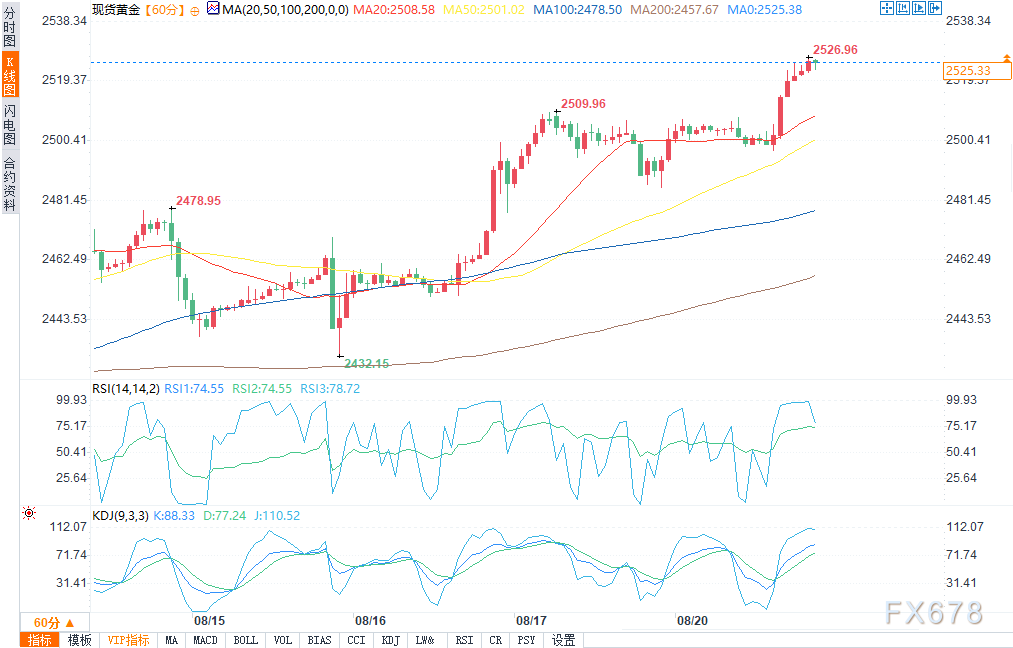 周五,芝加哥联储主席Austan Goolsbee表示,美国劳动力市场和一些领先的经济指标正在闪烁警告信号,表明信用卡拖欠率正在上升。美国7月份房屋开工数据弱于预期,也加剧了看跌情绪。总体而言,金融市场认为美联储9月份降息25个基点的可能性为100%,更大幅度的降息50个基点仍有可能。目前,投资者正在关注美联储主席鲍威尔在怀俄明州杰克逊霍尔的讲话,以及本周晚些时候最新的联邦公开市场委员会会议纪要,以寻求有关货币政策路径的更多指引。