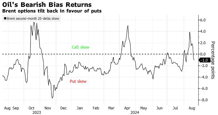 智通财经获悉,随着对以色列和哈马斯将同意停火的预期增强,以及伊朗暂时不愿发动报复性袭击,石油期权市场的看涨情绪正在消退。在上周达到近4个月来的最看涨水平后,石油期权市场的偏斜度——防范价格上涨或下跌的成本——在过去几天又回落至看跌水平。交易员此前曾对中东地区局势的新一轮升级进行对冲,该地区的石油产量约占全球的三分之一。