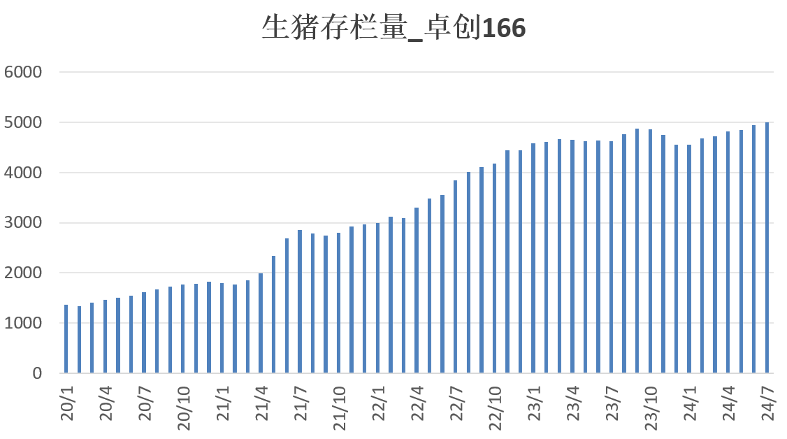 卓创数据显示2024年7月份样本猪企生猪存栏量为4990.49万头,增加56.66万头,样本企业的生猪存栏量已经处于非瘟后最高水平,和此前预估生猪出栏水平趋势一致,从存栏结构看,当前生猪实际供应的养殖端压栏影响较大,后续供应压力依然存在。