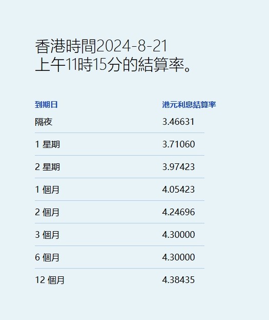 8月21日,港元拆息持续偏软,隔夜息再跌4基点至3.46631%,续创5月7日以来新低,而与楼按相关的一个月拆息亦四连跌,报4.05423%,见一周低位。