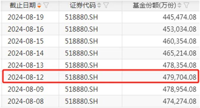 数据显示,截至8月19日,近5个交易日内,华安黄金易ETF份额持续下滑。8月19日,其份额已降至44.55亿份,较8月12日的历史峰值快速减少了3.42亿份。其中,8月16日、8月19日,其份额均减少了7000万份以上。