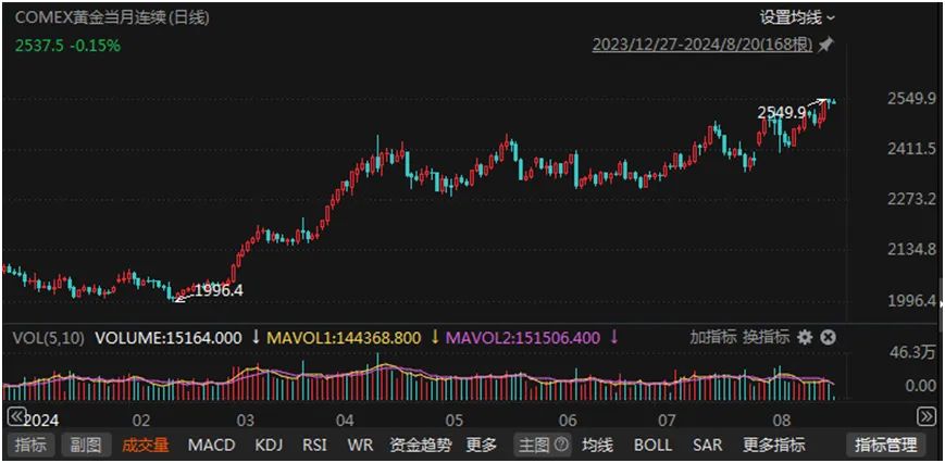 8月16日以来,COMEX黄金大涨,并在8月19日创出2549.9美元/盎司的盘中新高,市场关注度再度提升。但在这波拉涨后,8月20日,COMEX黄金出现高位波动。