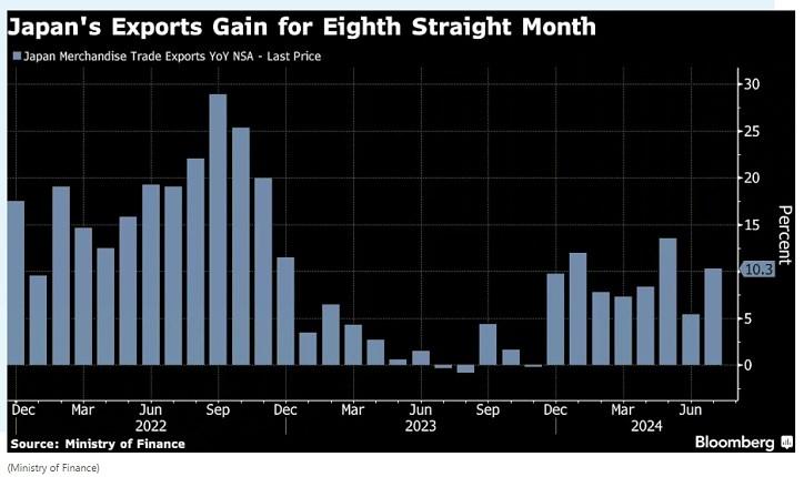 日本央行正在密切关注经济和金融市场,以寻求经济良性循环,而海外出口的复苏是它缺失的一块。日本央行7月31日的加息和行长植田和男的鹰派信号,导致本月初全球市场崩盘。