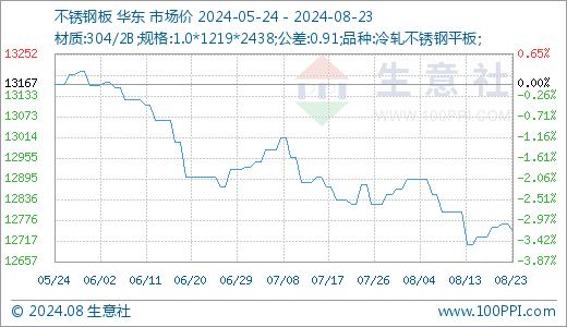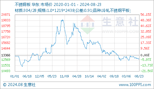 据生意社价格监测,本周不锈钢价格先上涨后下跌。截止8月23日,现货304/2B不锈钢平板1.0*1219*2438(公差0.91)的日均价为现报价12750元/吨,较周初下跌0.06%,同比下跌10.88%。