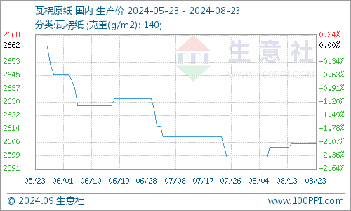 据生意社商品行情分析系统监测:本周瓦楞纸价格止涨维稳。8月23日瓦楞原纸140g出厂价格均价为2606元/吨,与8月18日均价相比保持平稳。