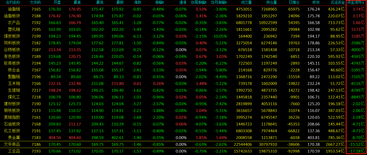 8月23日,文化商品指数呈资金流出态势,流出金额15.52亿元。资金流入油脂、塑化、煤炭板块。流出板块包括贵金属、化工、石油、钢铁等。