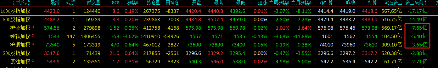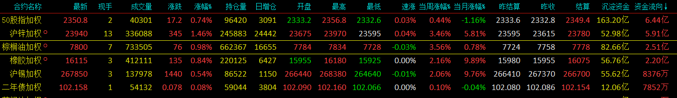 其中,沪锌加权、棕榈油加权、橡胶加权资金流入分别为5.91亿、2.51亿、2.2亿,使得三个品种主力合约全部收红。而沪金加权、纯碱加权、沪铜加权资金流出分别为7.65亿、5.4亿、3.65亿。近期,资金连续两日流出沪金加权,沪金或将面临调整;资金持续流入沪锌、棕榈油,使得期货价格持续反弹。