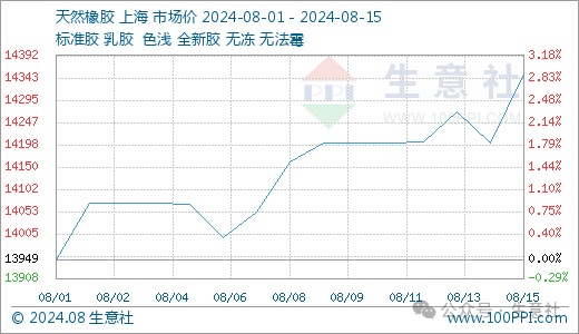 据生意社商品行情分析系统,近日国内天然橡胶现货行情震荡走高,截止8月15日我国天然橡胶市场现货胶价格在14352元/吨左右,较8月5日的14069元/吨上涨2.01%。一方面原料价格窄幅走高,另一方面下游开工小幅走低,天然橡胶在成本支撑及需求偏弱共同影响下小幅波动。