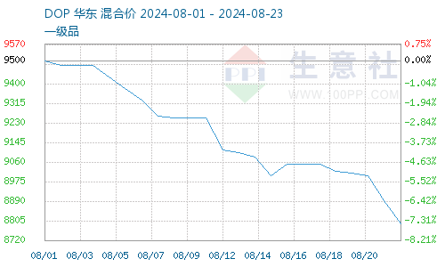 据生意社商品行情分析系统,截止8月23日,增塑剂DOP价格8791元/吨,较上周末8月16日DOP价格9051元/吨下跌,跌幅2.87%。终端需求恢复缓慢,原材料辛醇价格下跌,成本下降,下游客户下单积极性下滑,观望情绪提升,增塑剂成交下滑,增塑剂DOP价格下跌。