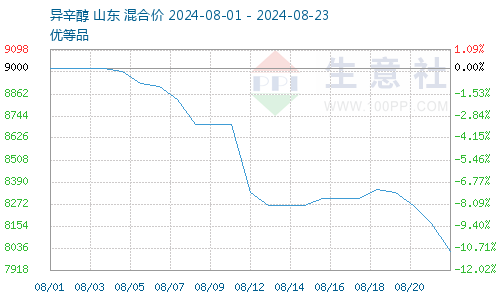 据生意社商品行情分析系统,截止8月23日,异辛醇报价8016.67元/吨,较上周末8月16日异辛醇报价8300元/吨震荡下跌,跌幅3.41%。异辛醇厂家检修结束开工恢复,异辛醇供给充足;增塑剂需求不佳,下游企业对辛醇采购积极性下降,异辛醇厂家降价出货,异辛醇价格下跌压力加大,异辛醇价格下跌。