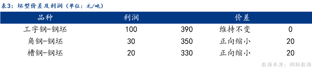 从坯型价差来看,工字钢与钢坯价差维持不变;角钢、槽钢与钢坯价差正向缩小。