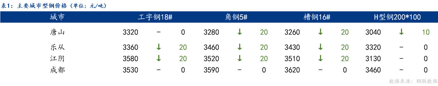今日型钢主流价格稳中偏弱运行,唐山工字钢、角钢、槽钢、H型钢价格较上一交易日稳中下跌10-20元/吨;乐从工字钢、角钢、槽钢、H型钢价格较上一交易日稳中下跌20元/吨;江阴工字钢、角钢、槽钢、H型钢价格较上一交易日稳中下跌20元/吨;成都工字钢、角钢、槽钢、H型钢价格较上一交易日价格持平。