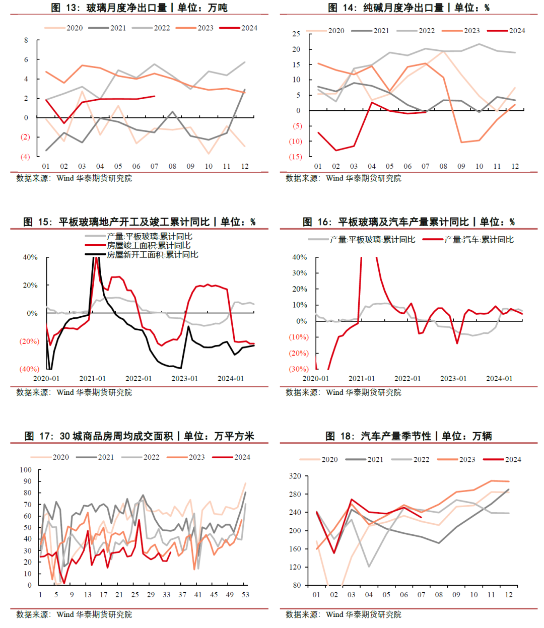 房地产政策、宏观数据情况、光伏产业投产、纯碱出口数据、浮法玻璃产线复产冷修情况等。