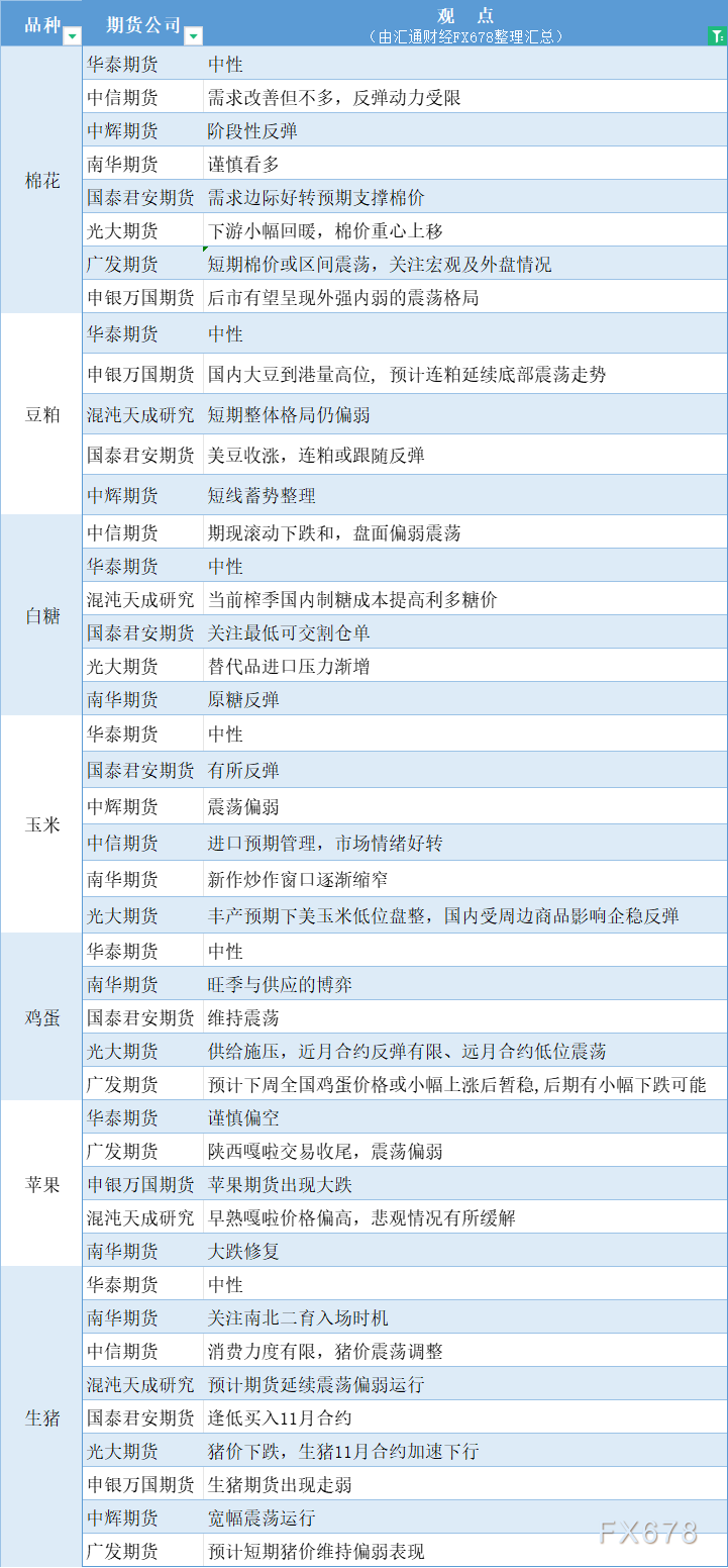 汇通财经APP讯——期货公司观点汇总一张图:4月26日农产品(棉花、豆粕、白糖、玉米、鸡蛋、生猪等)