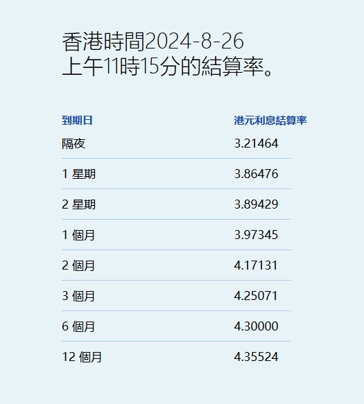 8月26日,港元拆息普遍走低,其中,隔夜息连跌六天,今报3.21464%,创四个月新低,而与楼按相关的一个月拆息亦七连跌,报3.97345%,续创4月24日以来最低,一过一周钱及一年期拆息报升。
