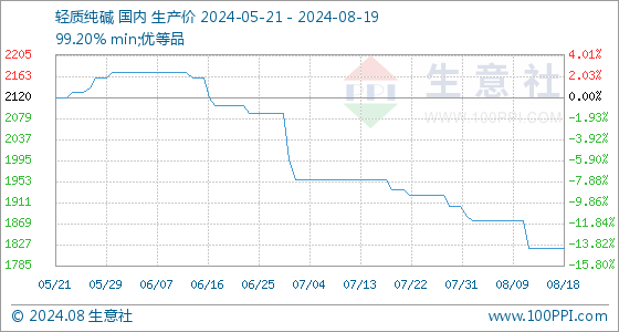 8月19日,生意社轻质纯碱基准价为1820.00元/吨,与本月初(1904.00元/吨)相比,下降了-4.41%。