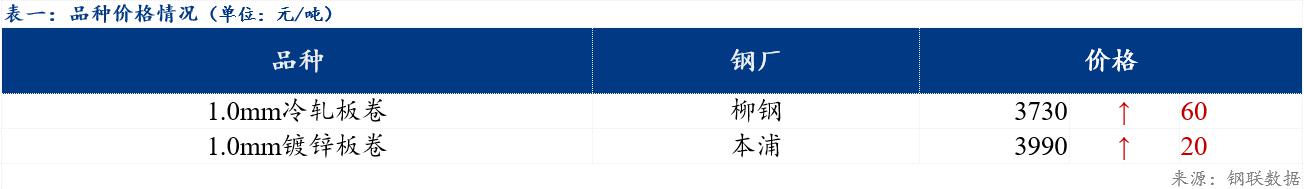 今日市场冷轧板卷主流资源价格3730元/吨,较上一交易日上涨60元/吨;镀锌板卷主流资源价格3990元/吨,较上一交易日上涨20元/吨。