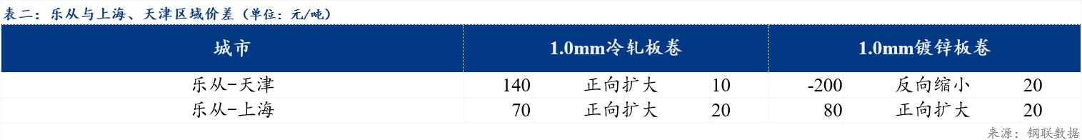 今日冷轧板卷乐从与天津价差较上一交易日扩大10元/吨,乐从与上海价差较上一交易日扩大20元/吨;镀锌板卷乐从与天津价差较上一交易日收窄20元/吨,与上海价差较上一交易日扩大20元/吨。品种价差方面,镀冷价差较上一交易日收窄40元/,镀热价差较上一交易日收窄60元/吨,冷热价差较上一交易日收窄20元/吨。
