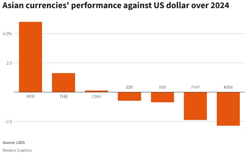 与此同时,巴西雷亚尔、泰铢、印尼盾和马来西亚林吉特等货币升值了约5%。