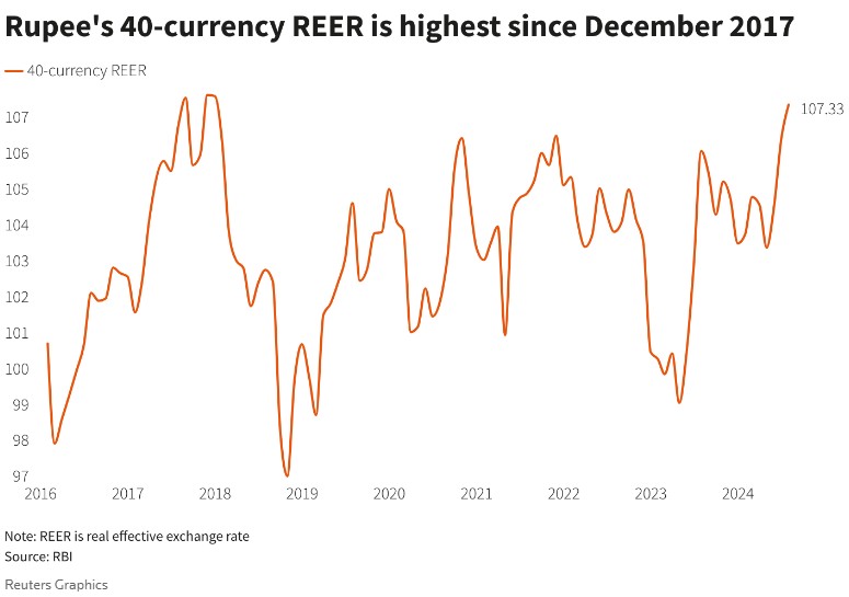 印度央行可能会对卢比表现不佳表示欢迎,因为卢比的实际有效汇率(REER)——衡量其竞争力的指标——上个月升至近7年来的高点。