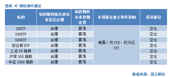 8月23日美国联邦储备委员会主席鲍威尔发表鸽派言论,他认为调整货币政策的“时机已到”。9月份美联储降息已基本板上钉钉。市场更关注今年下半年美联储降息的次数以及幅度。若9月份下降25BP,预期降息不会给市场带来较大扰动。美国衰退交易近期也大幅降温,当前数据很难证明美国经济将面临硬着陆。海外市场短期或继续在高位震荡。A股8月成交量已降至年内低位,市场交易热情不高。目前市场无论是宏观层面还是政策层面都难寻亮点,投资者偏谨慎。短期来看,市场缺乏明确方向性机会,市场交投不活跃,热点题材较少,短期实现大幅上涨或下跌都较难。中长期来看,目前股指估值处在近10年低位,政策较为友好,市场下跌空间有限,且有超跌反弹机会,投资者可继续等待做多时机。股指期货方向性交易,建议投资者暂时空仓观望。投资者可轻仓参与套利交易,做多IC合约,做空IH合约。期权方面,短期市场方向不明确,波动有上升的可能,同样建议投资者暂时维持空仓。