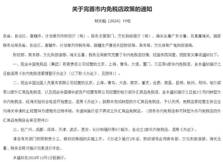 近日,财政部、商务部、文化和旅游部、海关总署、税务总局印发《关于完善市内免税店政策的通知》(下称《通知》),明确自2024年10月1日起,按照《市内免税店管理暂行办法》(下称《办法》)规范市内免税店管理工作,促进市内免税店健康有序发展。