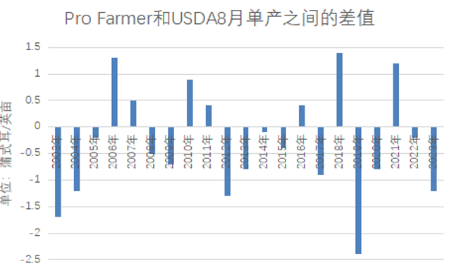 一是Pro Farmer单产相较于8月USDA单产倾向下调。过去21年里,有14年低于8月单产数据,有7年高于8月单产,且最近5年中有4年低于8月单产数据,所以从历史概率的角度,Pro Farmer公布的单产数据倾向于下调。
