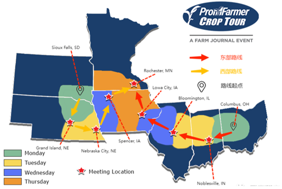 Pro Farmer作物巡查团由大约100名分析师、农场主以及媒体记者组成,前往7个大豆玉米主产州,包括伊利诺伊州、衣阿华州、内布拉斯加州、明尼苏达州、印第安纳州、俄亥俄州和南达科他州,对1000多块玉米和豆田的作物进行观察和测量,以确定作物单产潜力。由于大豆成熟时间和收获时间要比玉米晚几周,所以前四天的考察并不公布对大豆作物的单产预估,而是采用一些客观数据(3×3英尺农田里的豆荚数量)进行评估参考。