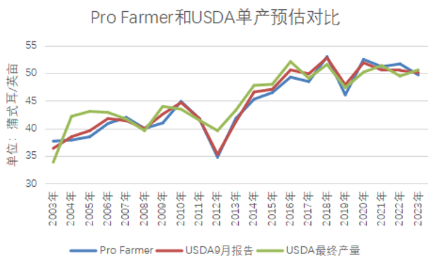 二是Pro Farmer单产与9月USDA单产之间的差距较小,与最终单产之间的差距更大一些。Pro Farmer单产预测对比USDA9月报告平均低0.28蒲式耳/英亩,对比最终单产平均低0.85蒲式耳/英亩,而近五年该数据分别为高0.04蒲式耳/英亩、高0.42蒲式耳/英亩。
