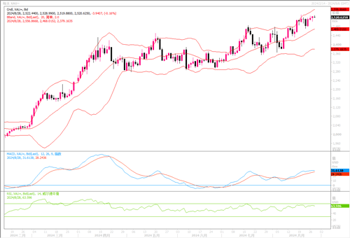 技术层面上,日线级别图上,金价继续保持在布林带通道上轨运行,近期出现过调整也仅仅是浅尝辄止,调整幅度现当有限,显示黄金多头力量之顽强。若本周上述提到过的美国一系列数据差于预期,黄金则很可能借机发力再创新高峰。目前下方需留意的初步支撑再2480,若跌穿该位置,则当心黄金进入下落调整风险。