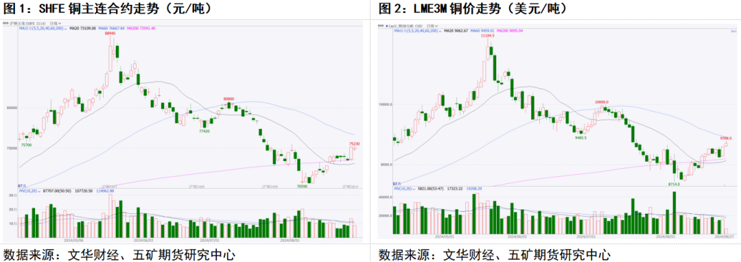 从宏观上看,前期风险资产大幅回落和美国就业市场降温、通胀进一步下滑都支持美联储货币政策转向。当前在美联储即将降息的时间节点,情绪上对铜价相对积极。铜矿端,二季度主要铜矿企业生产报告显示全球铜矿供应预期有所下调,矿端表现为短期供需边际宽松,中期仍有收紧预期。国内供需方面,铜价连续反弹后中国精炼铜库存去化动力预计减弱,但同时也要看到,随着传统旺季到来以及政府债发行速度加快,铜下游消费预计仍将保持一定的韧性。海外供需方面,主要经济体制造业PMI反映出铜需求预期偏弱,但海外累库压力趋于下降,库存对铜价的压力有望减轻。总体预计铜价有望延续震荡偏涨的走势,铜期货持仓变化亦表明资金对行情的支持。