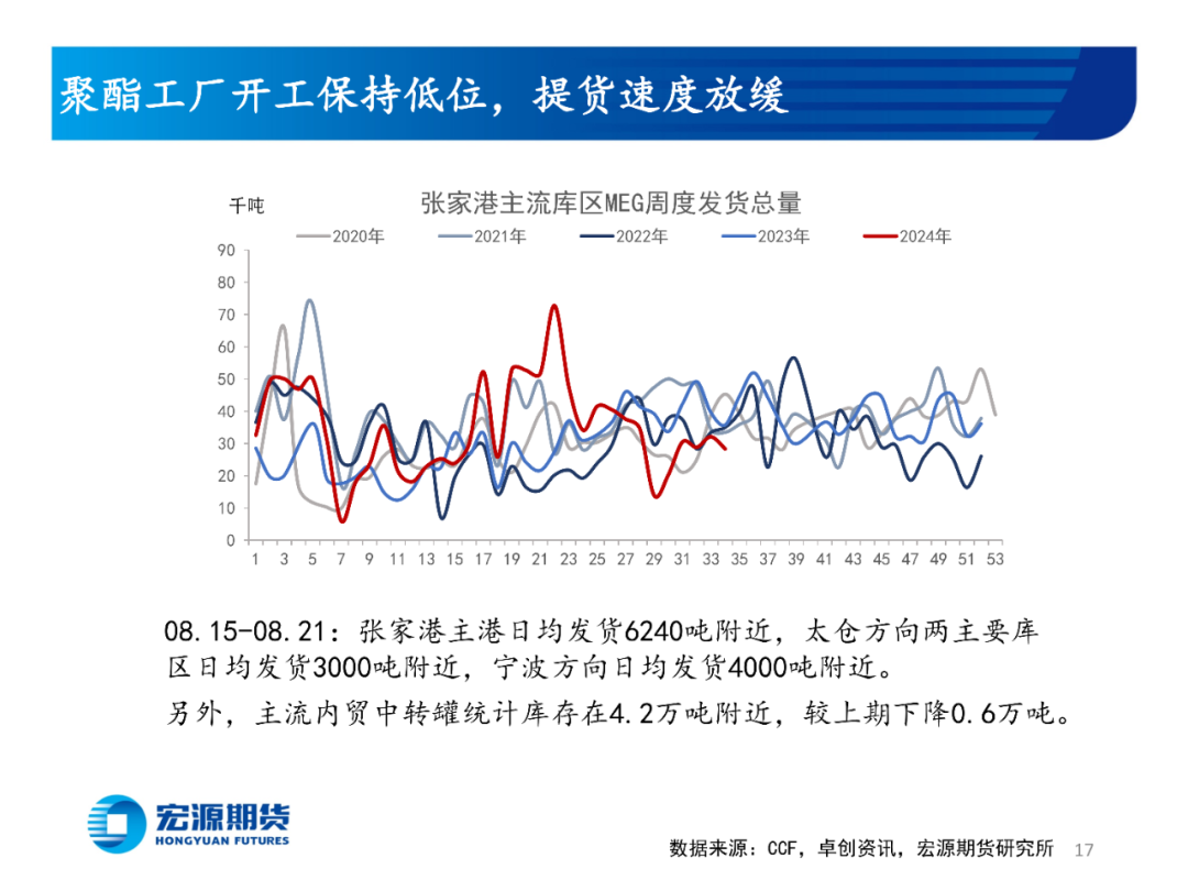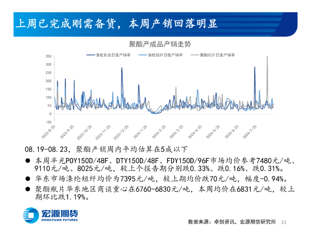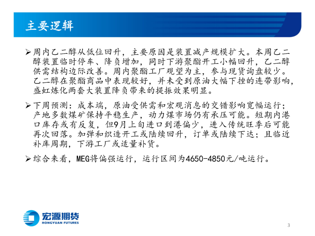 下周预测:成本端,原油受供需和宏观消息的交错影响宽幅运行;产地多数煤矿保持平稳生产,动力煤市场仍有承压可能。短期内港口库存或有反复,但9月上旬进口到港偏少,进入传统旺季后可能再次回落。加弹和织造开工或陆续回升,订单或陆续下达;且临近补库周期,下游工厂或适量补货。
