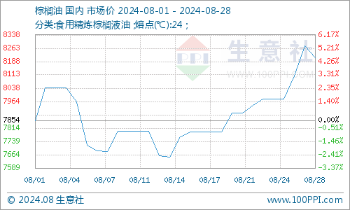 据生意社商品行情分析系统显示:8月棕榈油行情涨跌互现,振荡上涨为主,涨幅超4%。8月1日,棕榈油市场均价7854元/吨,8月28日,棕榈油市场均价8210元/吨,价格上涨4.53%。