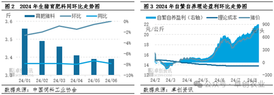 受2023年猪病导致生猪产能去化影响,以及饲料价格下行,成本降低下带动养殖盈利跟随猪价屡冲新高。图2显示,进入2024年生猪育肥饲料价格呈现持续下滑趋势,截至6月底,全国育肥猪料3.39元/斤,同比下滑7.8%。而受饲料成本下滑以及猪价上涨影响,养殖行业头均理论自繁自养盈利涨幅明显。根据卓创资讯监测,截至8月23日,生猪理论自繁自养盈利均值为771.10元/头,环比增加72.36元/头,涨幅10.00%。图3显示,截至2024年3月15日自繁自养盈利由负转正,此后自繁自养开始出现一路上涨态势。