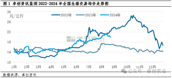 图1显示,2024年三季度猪价冲高后回落。据卓创资讯数据监测,截至2024年8月27日,全国外三元交易均价为19.53元/公斤,较昨日下滑0.30元/公斤。消费淡季下猪价上行其主因是前期猪病造成的供应去化,部分二次育肥入场对行情形成有利托底,以及养殖端压栏情绪等带动猪价上行,而压栏及二育行为造成供应后置,导致猪价冲高回落,亦带动养殖盈利、二次育肥盈利上行到全年高点并回调。