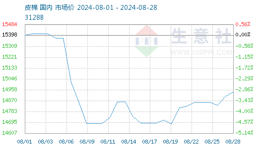 8月棉花供应充足叠加淡季氛围下需求长期处于偏弱的格局,棉花现期货继续大幅下跌。同时内外共振下,国内棉价创下近4年来的最低位。之后宏观层面利好,外围市场释放积极信号,棉价小幅回弹。据生意社商品行情分析系统,8月28日3128B级皮棉现货价格在14940元/吨,较月初下跌2.98%。