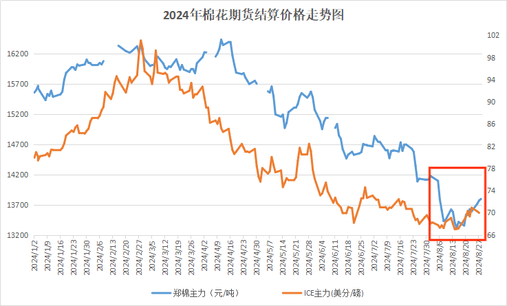 棉花期货内外联动性较强,期棉上涨与美元指数持续走弱有一定关系,美棉的强势上涨也带动郑棉反弹。8月郑棉结算价最低在13320元/吨后,美棉结算价最低在67.05美分/磅,之后美联储降息预期加大,宏观利好下期货价格出现反弹。截至28日,郑棉主力合约结算价在13795元/吨,较月初下跌2.68%。