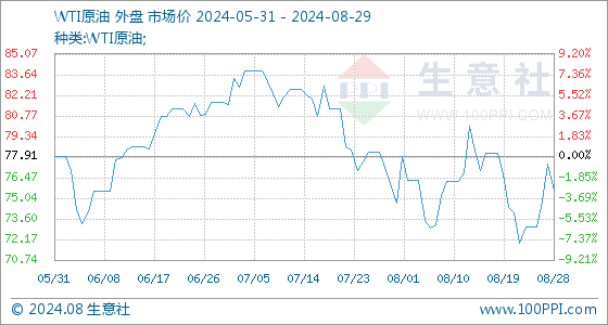 8月29日生意社WTI原油基准价为75.53美元/桶