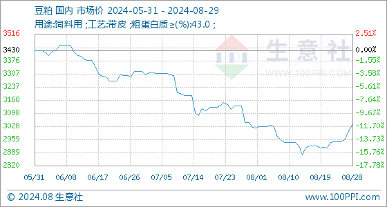 8月29日,生意社豆粕基准价为3040.00元/吨,与本月初(3022.00元/吨)相比,上涨了0.60%。