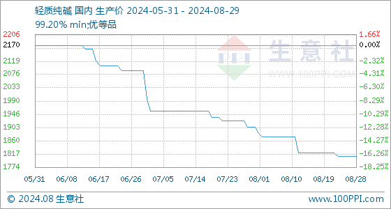 8月29日,生意社轻质纯碱基准价为1810.00元/吨,与本月初(1904.00元/吨)相比,下降了-4.94%。