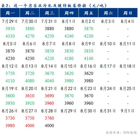 截止2024年8月28日17:30,冷轧板卷月均价为3761元/吨,镀锌板卷月均价为4095元/吨。